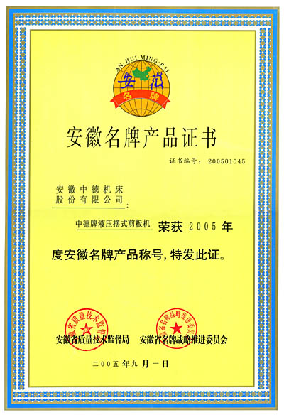 “中德牌”剪板機(jī)榮獲2005年“安徽名牌產(chǎn)品”稱號(hào)
