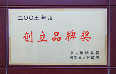 我公司由于2005年獲得了“安徽省名牌產(chǎn)品”和“安徽省著名商標(biāo)”兩項榮譽,被縣委、縣政府評為“2005年度創(chuàng)立品牌獎”,兩項榮譽分別獲得現(xiàn)金10000元的獎勵!