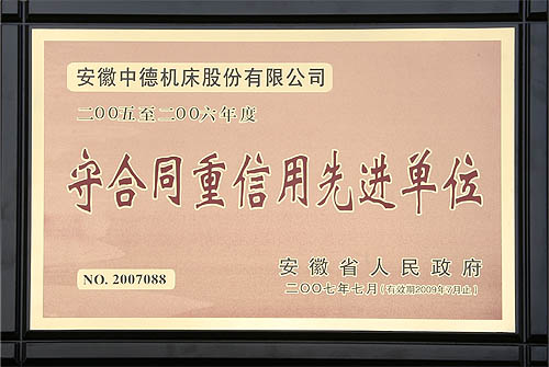 近日,安徽中德機床股份有限公司被安徽省人民政府授予2005-2006年度“守合同重信用先進(jìn)單位”這一稱號。這也是我公司繼由馬鞍山市工商局、市人民政府、省工商局多次授予此類稱號后,再次獲得的更高級別的榮譽。